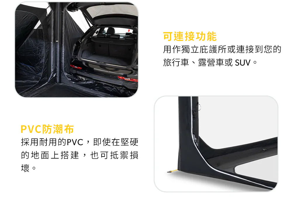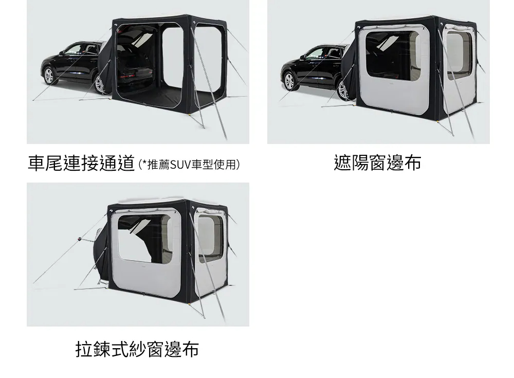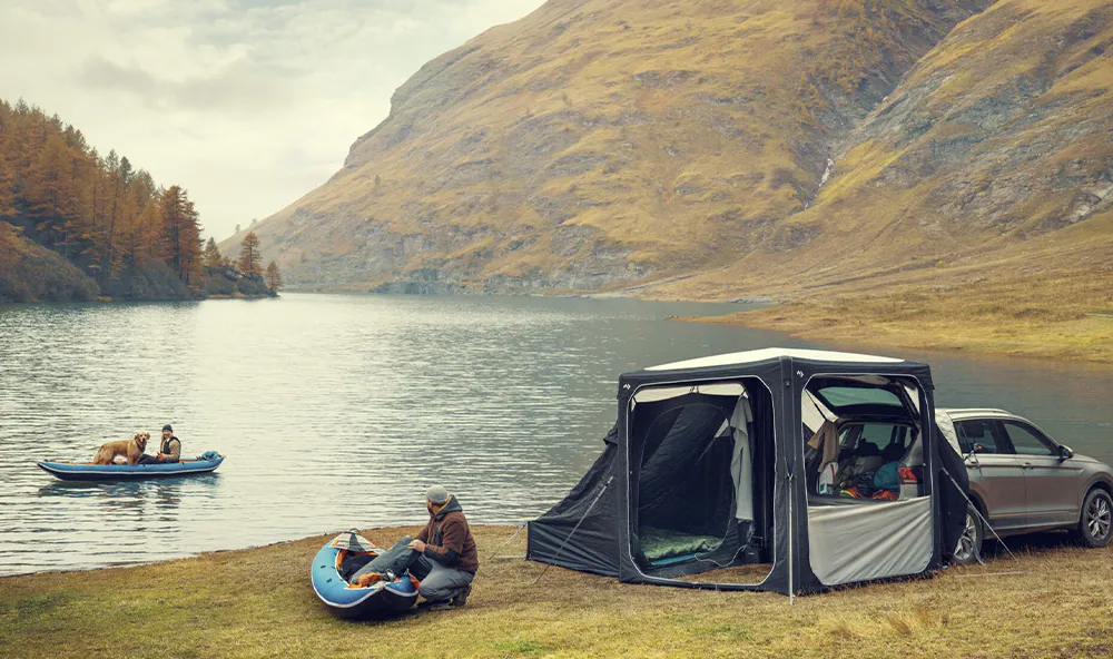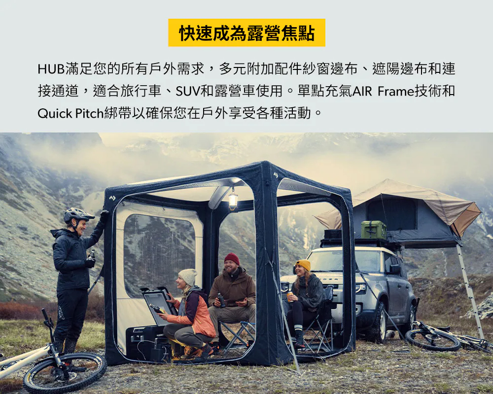 調整HUB,滿足您的多元需求。為基礎帳篷添加各種配件、網紗模組、側壁模組以及連接過道,輕鬆連接至旅行車、SUV 和露營車。單點充氣AIR Frame 技術和快搭拉扣確保您能快速固定帳篷,立即享受戶外時光。